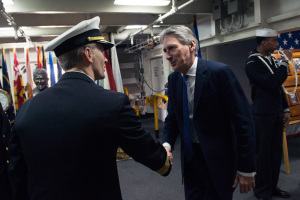 150108-N-WA993-021 YOKOSUKA, Japan (Jan. 8, 2016) Adm. Joseph Aucoin, Commander 7th Fleet, greets the Rt Honorable Philip Hammond MP, right, Secretary of Foreign and Commonwealth Affairs, on the ceremonial quarterdeck of the U.S. Navy's only forward-deployed aircraft carrier USS Ronald Reagan (CVN 76). The United Kingdom's Secretary of State for Foreign and Commonwealth Affairs and Secretary of State for Defense's visit to Ronald Reagan reflects the strong relationship between the United States, the United Kingdom, Japan and their partners in the Indo-Asia-Pacific region. (U.S. Navy photo by Mass Communication Specialist 3rd Class James Lee/Released) 150108-N-WA993-021 YOKOSUKA, Japan (Jan. 8, 2016) Adm. Joseph Aucoin, Commander 7th Fleet, greets the Rt Honorable Philip Hammond MP, right, Secretary of Foreign and Commonwealth Affairs, on the ceremonial quarterdeck of the U.S. Navy’s only forward-deployed aircraft carrier USS Ronald Reagan (CVN 76). The United Kingdom’s Secretary of State for Foreign and Commonwealth Affairs and Secretary of State for Defense’s visit to Ronald Reagan reflects the strong relationship between the United States, the United Kingdom, Japan and their partners in the Indo-Asia-Pacific region. (U.S. Navy photo by Mass Communication Specialist 3rd Class James Lee/Released)